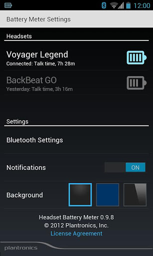 Wondering if your headset has enough charge to last another call?Instantly see the remaining charge of your connected Plantronics bluetooth ョ headset or easily switch to a previously connected Plantronics headset that has more available battery charge.How it works:窶「 See up to four bars of available battery charge for your connected Plantronics headset.窶「 Receive on-screen alerts to a low battery or when charging is complete.窶「 Tap widget to view charge levels for up to five previously connected Plantronics headsets.窶「 Tap to reconnect to a listed Plantronics headset with more available charge. 窶「 Explore widget options of either 2x1 or 1x1 orientation and three background designs.Compatibility: - Works only onphones or tablets running Android邃「 3.0+ and 4.0, 4.1 (A bug in Android 4.2 and 4.2.1 currently prevents the app from reporting battery status. google has confirmed that the bug has been resolved in the next release of Android.)- This battery meter widget supports the following Plantronics headsets:o Voyager Legend邃「o Voyagerツョ PRO HDo Voyagerツョ PRO UCo Marque邃「 M155邃「 o Marque 2邃「 (M165邃「)o M25邃「 o M55邃「o BackBeatツョ GO o Savor邃「 M1100邃「o Blackwireツョ C710邃「/C720邃「Support & Feedback:Need more help? For technical support or questions, visit http://www.plantronics.com/us/support/Share your ideas!We love hearing your ideas and feedback. email us at mobileapps@plantronics.comKeywords: Plantronics, headset, battery, meter, Bluetooth