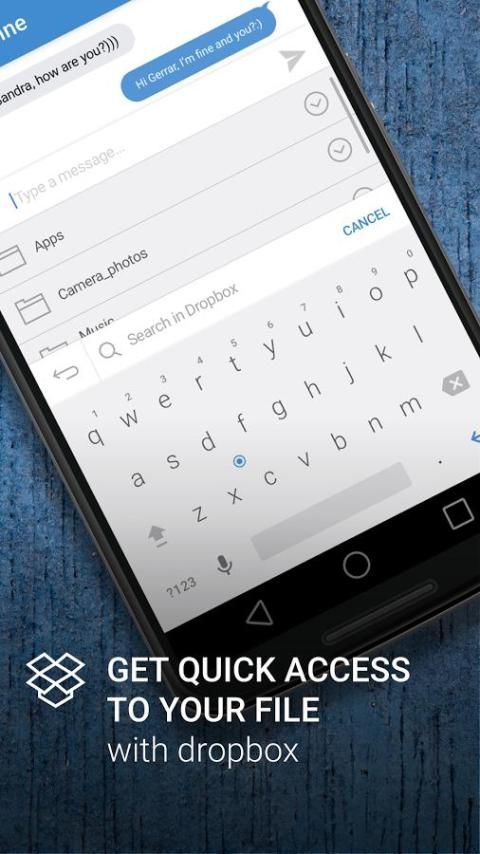 تثبيت البرنامج المساعد دروببوإكس للبحث ومشاركة المحتوى دروببوإكس. ما عليك سوى النقر على رمز الإضافة دروببوإكس ويمكنك الحصول على إمكانية الوصول الفوري إلى ملفات دروببوإكس من داخل لوحة المفاتيح، دون الحاجة إلى فتح التطبيق.