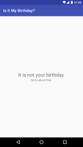 أدخل تاريخ ومعرفة ما إذا كان اليوم هو عيد ميلادك.مفيدة بشكل مثير للدهشة إذا نسيت يوما ما اليوم.لا تحتاج إلى تطبيق تقويم، وبالتأكيد لا تحتاج إلى اسحب أسفل ظلال الإخطار.فقط افتح هذا التطبيق، وقضاء الوقت fiddly ضبط التسجيل المغازل وضرب الزر!سيستخدم التطبيق التكنولوجيا الثورية باستخدام java.util.date لتحديد ما إذا كان شهر التاريخ واليوم الحالي لهذا الشهر مساويا لما دخلته.