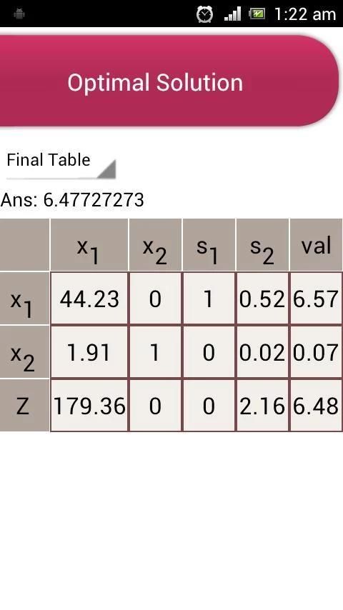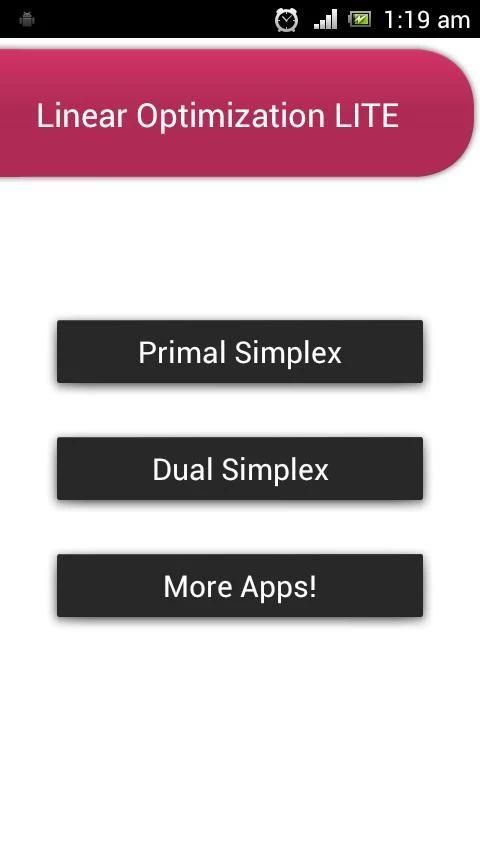 هذا التطبيق يحل مشاكل التحسين الخطي باستخدام الأسلوب البسيط والبدائية المزدوج الطريقة المبسطة.