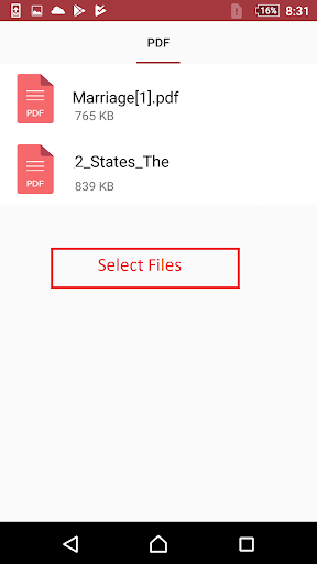 Select PDF files with Plus sign. PDF files will be selected from the folders be in SD card or phone.