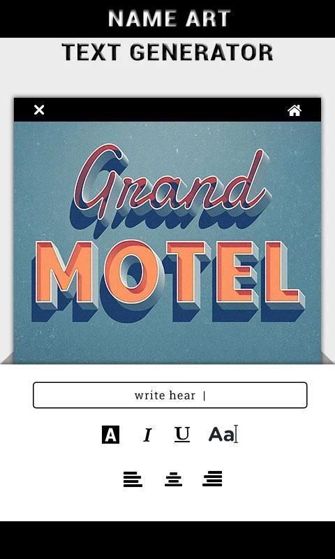 أقترح لك افضل تطبيق ذي كمية هائلة من التحميل 30,000+ مستحدمين يحملون Name Art Text Generator احدث الاصدار مجانا كل أسبوع في انه سهل جدا لدراسة كيف استخدامه..9Apps هذه التطبيق الحلوووه تصدر في 2017-11-09 يمكنك تجد بعض التطبيقات المشبهة هنا..