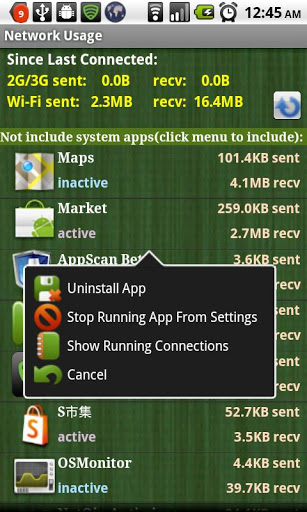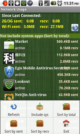 Network Usage is an utility which shows both 3G and wifi traffic usage since last connected. It also lists all app39;s network usage and sorts them based on the amount of data sent and received. This helps user to notice which app consumes most bandwidth and may need to uninstall or stop the process. It has been tested on Nexus one. Please send bug report back if you encounter any problem on your model. Any feedback is highly welcome. note Some phone models do not enable uidstatkernel level configured by phone manufacturer, the network stat for each app might not be displayed correctly.always 0 thus list active connections instead.keyword net counter, realtime traffic, traffic counter, network stat.