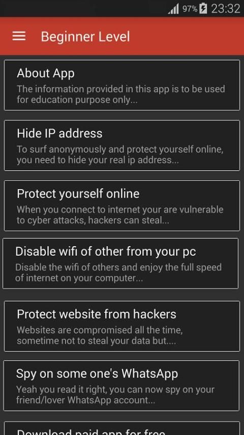 كل ما تحتاجه للبدء باعتباره القراصنة واتخاذ مهارات القرصنة الخاصة بك إلى مستوى الخبراء يتم تضمينها في هذا التطبيق. الانتقال من المبتدئين إلى هاكر الخبراء مع هذا أفضل خطوة بخطوة التقطيع دروس.