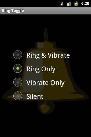 Simple app for toggling the ringer mode\nRing Toggle is a simple app which allows you to switch quickly among ring, vibrate, and silent modes, without fiddling around with any other android settings. Simply open the app and select a mode; the selected mode takes effect immediately.