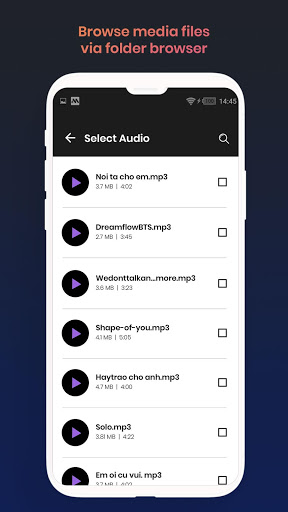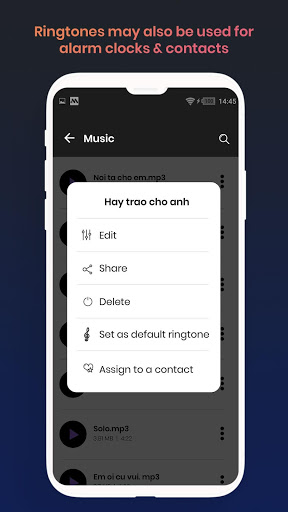 ➜ Easily choose the Songs, other audio files from the list. You can search the list of songs. Also Music, Ringtones, Notifications, Alarms are marked separately so that one can choose easily.