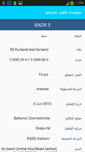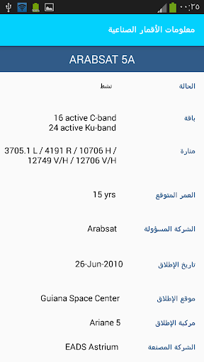 معلومات الأقمار الصناعية هو تطبيق معلومات شامل، والذي يعطيك معلومات مفصلة عن أكثر من 260 قمر صناعي بما في ذلك الوضع، الموقف، الإرسال،المنارات، الحزم، المشغل، تاريخ الإطلاق، موقع الاطلاق، مركبة الإطلاق، المصنع، العمر المتوقع وأكثر من ذلك