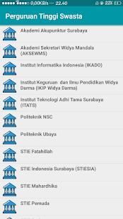 This application is used to facilitate the public in terms of location search Private Universities (PTS) in Surabaya which there are information. To determine the institutional accreditation and accreditation of majors, the system will connect directly to the website BAN-PT.