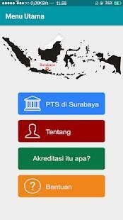 Aplikasi ini digunakan untuk memudahkan masyarakat dalam hal pencarian lokasi Perguruan Tinggi Swasta (PTS) di Surabaya yang didalamnya terdapat informasi. Untuk mengetahui akreditasi institusi dan akreditasi jurusan, sistem ini akan menghubungkan langsung dengan website BAN-PT.