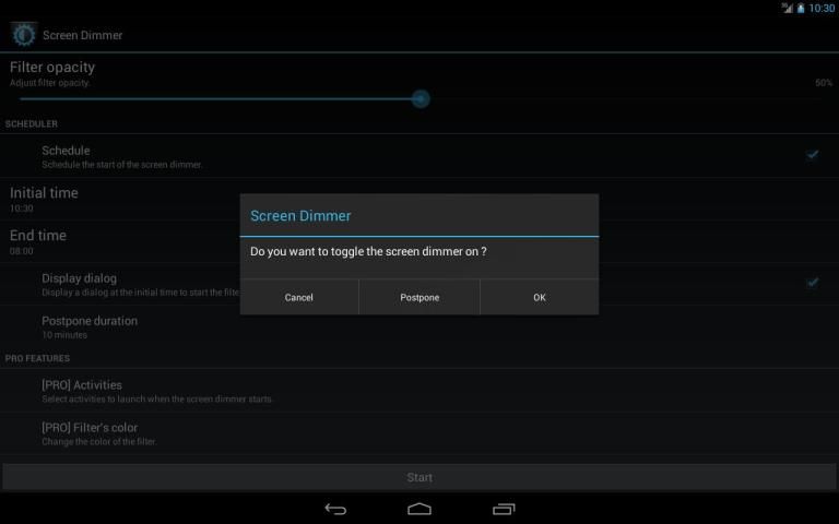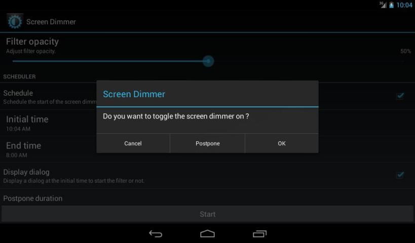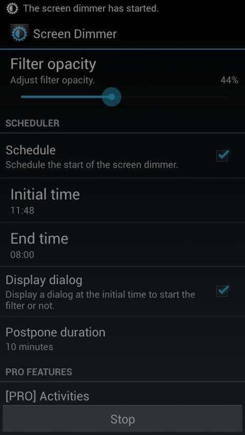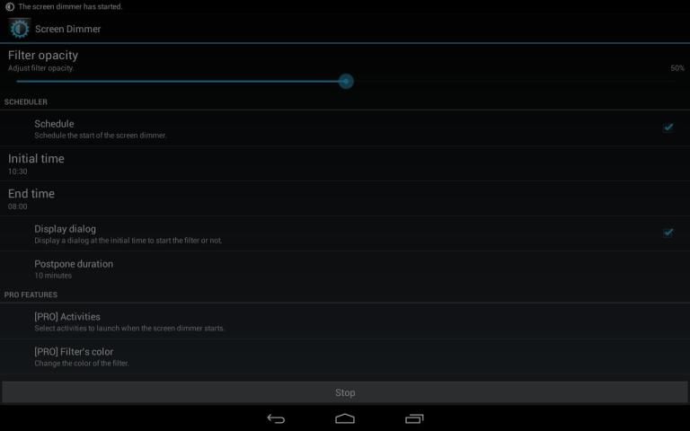 Enhanced notification : click on the brightness icon to stop Screen Dimmer or click on the progress bar to change the filter's opacity.