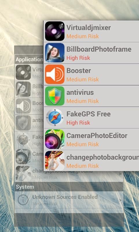 الأمن مكافحة الفيروسات النظيفة المحمول بسرعة تحليل الوضع الأمني في جهاز الروبوت الخاص بك في العمق. بأمان إزالة التهديدات لجعل حياتك المحمول أو الكمبيوتر اللوحي البقاء آمنة. مسح منتظم سيبقي جهاز Android healthy.Just جهاز مخابئ تطبيق نظيفة وتطبيق الملفات غير المرغوب فيه. هذا يجعل من الجهاز الخاص بك خالية من البرامج الضارة، ونقاط الضعف، ادواري، وأحصنة طروادة فقط click.Free واحدة الذاكرة (RAM) وتعزيز هاتفك المحمول. لمسة واحدة لتسريع الأجهزة الخاصة بك والافراج عن الذاكرة. يغلق تلقائيا تطبيقات الخلفية، والحفاظ على الهاتف الخاص بك في أفضل التطبيق performance.This كشف عن التهديدات التي تبطئ الهاتف المحمول والسيارات غير المرغوب فيها تثبيت التطبيق في هاتفك النقال، وبعد ذلك يمكنك تنظيف الملفات الخبيثة من هاتفك من خلال هذا التطبيق الأمني لمكافحة الفيروسات. ميزات الأمان