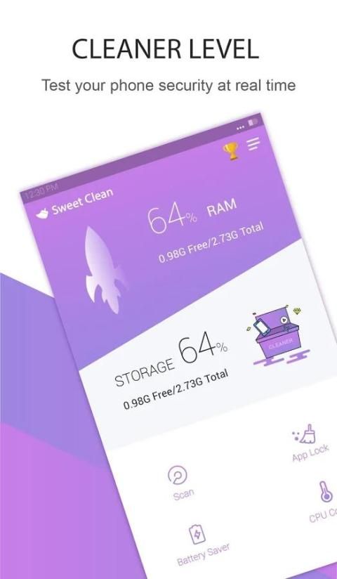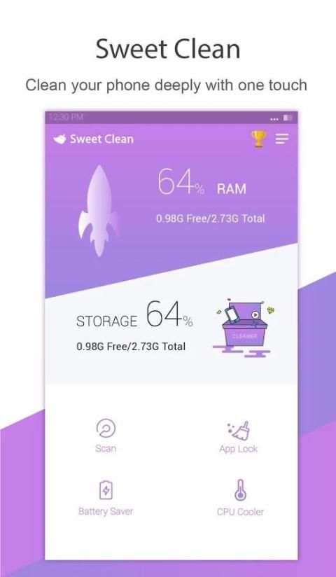 الحلو النظيف هو فقط الكل في واحد الداعم سرعة ونظافة القمامة ومكافحة الفيروسات التطبيق الذي يحسن تطبيقات الخلفية الخاصة بك، ومساحة الذاكرة والملفات غير المرغوب فيه (مخبأ). مع الحفاظ على جهازك في مأمن من الفيروسات وحصان طروادة، التي يمكن أن تأمين البيانات الخاصة مع وظيفة AppLock.