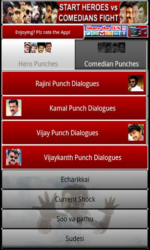 500 Punch amp; Comedy Dialogues, ringtones from Tamil Movie Stars and ComediansOfficially the No.1 TAMIL MOVIECOMEDY APP on the android Market Thanks for your tremendous support 45,000 Downloads from Tamil users and counting...Newly added in version 2.6Like Tamil Movies ? Try our newly launched superhit Tamil app: WATCH TAMIL MOVIES FREEDialogue Count Crosses 500, yes 500 dialoguesringtones in one app.1.AJITH39;s BILLA2 Exclusive Punch Dialogues and Ringtones2.All new SANTHANAM comedy dialogues from Oru Kal Oru Kannadi OKOK superhit comedy movie3.By audience demand DHANUSH39;s SACHIN theme Ringtones added4.New fight dialogues added for GANJA KARUPPUEnjoy All dialogues can be set as ringtones Listen amp; set as ringtones over 500 Superhit Tamil Movie Punch Dialogues and Hilarious Comedy Dialogues by Kollywood stars like Rajini, Kamal, Vijay, Ajith, Goundamani, Santhanam, Vadivelu, T.Rajendar, Vijayakanth, Senthil, Vivek, Surya, Simbu, Vikram, Madhavan, Karunas, Ganja Karuppu and Dhanush all in one place.Don39;t miss the amazing quot;HEROES vs COMEDANS FIGHTquot; or the PRESET fights, you just can39;t stop laughing.This is the BEST soundboardringtone android app for all Tamil cinema fans with a massive collection of famous, funny, memorable and powerful dialogues that made several superhit movies what they are today.Comments from our Users who love the appWow..awesome man..great work..first time im commenting in my life..really this is a stress reliefer 5 MohamedWat a rocking app Very innovative Loving it, but presets shud have heroes vs heroes .. like ajith vs vijay... wud hav been even more funnier :D 5 CricakilanSG AceAmazing app, which entertains me and people around. A must app for tamil comedy fans. Expecting timely updates as now. Hats off to the developers. 5 Yasser MGreatWow..... Excellent app....specially the fight.... Nice thinking.... 5 Senthil: G00d w T0 Rl T0.... 5 VimalanAbdulkathar , this very excellent time passing really I like really from london. 5 AbdulComments from our Users who love the appPlease don39;t forget to review the app on the Android Market, I39;m sure you39;ll love it