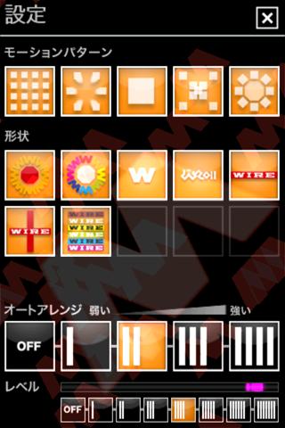 With WIRE Visualizer, you can become an instant VJWIRE VisualizerSound Visualizer WIRE 11 editionAn original app from WIRE11, one of the largest indoor rave partis in Asia organized by Takkyu Ishino, the leading techno artist from Japan.As if you are on the floor at WIRE full of colorful VJ graphics, you can experience visuals reacting real time to the sound coming through music from a microphone.The set up screen appearing by doubletapping the screen will enable you to set up various motion patterns and graphic materials, which will move automatically to sounds.You can also set up automatic motion changes using quot;Auto Arrange Functionquot; as well as adjusting the input volume levels. 7 different WIRE11 logo visuals are included in this VisualizerWith WIRE Visualizer, you can become an instant VJA must have for WIRE11 fansFeatures:5 Motion Patterns and 7 Graphic Materials, including various WIRE 11 logo visuals.4 level Auto Arrange Function enables to arrange the automatic changes in motionmaterials as you wish to set up.8 audio Input Levels to suit your outside environments.You can select and launch any usable Music player by Launch music app from Menu button. Launch music app menu wont show when WIRE Visualizer cannot find any applicable music player. Instant Tweets by Twitterquot; icon from Menu button. Direct link to WIRE11 official website by About this application from Menu button