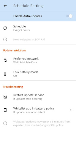 من كل ساعة إلى يوميا، يمكنك اختيار عدد المرات التي سوف تلقائيا -Update الخلفية الخاصة بك - دون لمس هاتفك. إذا كنت لا تحب ورق الحائط الذي تم اختياره، فيمكنك بسهولة تغييره إلى آخر بنقرة واحدة أو لفتة واحدة.