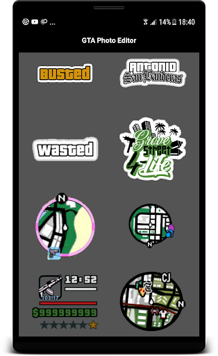 Press the Wasted Button to add Busted, Mission passed or Weapon Sticker to your Photo from a full list of Gaming Stuff. Drag the Sticker with touch to the places you want to have them. Scale up Stickers with multiple fingers or change their rotation. Save with the top right button and share with your friends via every messenger you like.