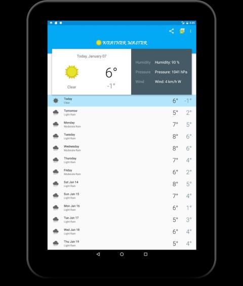 تطبيق الطقس ماستر هو التطبيق الروبوت بسيط، التي تساعد المستخدم لمراقبة الطقس. التطبيق تلقائيا بمزامنة بيانات الطقس بعد فترة زمنية معينة ويعطي توقعات الطقس لمدة 14 يوما المقبلة. بما في ذلك درجات الحرارة أعلى / أدنى، ومستويات الرطوبة وسرعة الرياح والضغط الجوي. يمكنك مشاركة المعلومات الطقس لتقترب من تلك الخاصة بك باستخدام المتاحة التطبيقات البريدية أو تطبيقات الرسائل. كما أن لديها دعم الروبوت ملابس. يمكنك تعيين ارتداء الساعات الوجه والحصول على التحديثات من التطبيق الخاص بك إلى جهاز يمكن ارتداؤها.