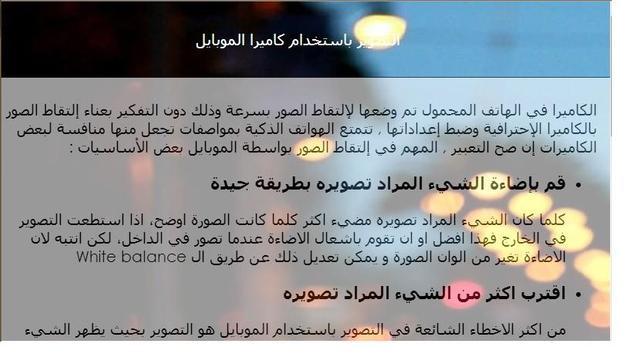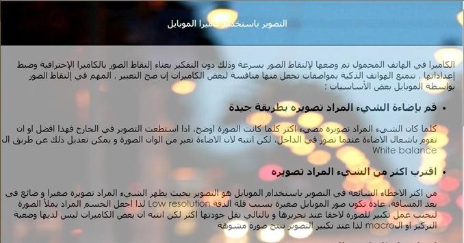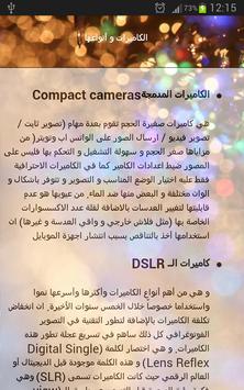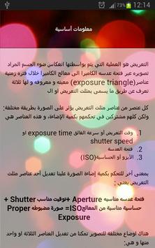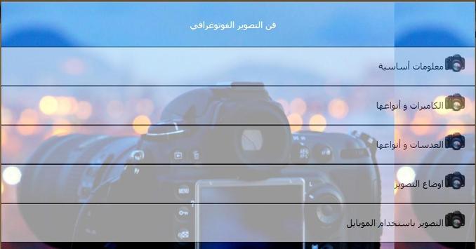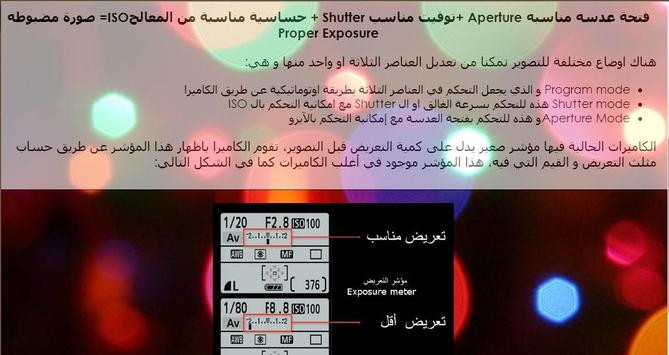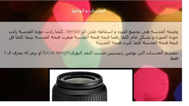 عن طريق هذا التطبيق تستطيع التعرف على المبادئ الأساسية التي تبنى عليها الكاميرات الرقمية، بالإضافة إلى أنواع الكاميرات و أنواع العدسات، كما أنك ستتعلم ما العدسات المستخدمة في وضعيات التصوير المختلفة، تعلم أيضا كيف تحصل على صور أكثر دقة عند التصوير باستخدام الموبايل أو الهاتف الجوال