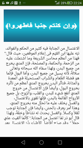 يقدم هذا التطبيق المجاني كيفية الإغتسال من الجنابة بدون إنترنت بالطريقة الصحيحية. لا داعي للانترنت لقراءة و فهم كيفية الإغتسال من الجنابة و الحيض و النفاس.