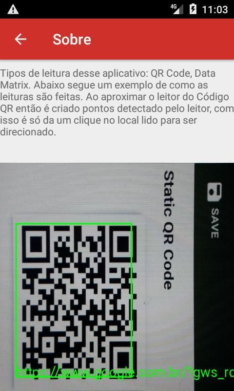 Tipos de leitura desse aplicativo: QR Code, Data Matrix.