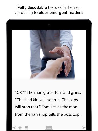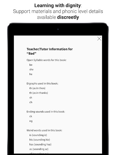 كبار السن الذين يعانون من صعوبات القراءة الشديدة لا ترغب في تسليم قارئ مستوي آخر أو "كتاب الطفل". تجمع هذه التطبيقات بين الصور عالية الجودة والعمر مع تصميم نظيف. يتم الاحتفاظ بمواد الدعم ومعلومات المستوى من الغلاف والخروج من النص الرئيسي لإعطاء المتعلمين تجربة "رواية قراءة" لتكون فخورة. يتم الإشارة إلى التقدم المحرز من خلال الكتاب وتشجيع التعليقات المصممة للمسلمين الأكبر سنا.