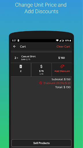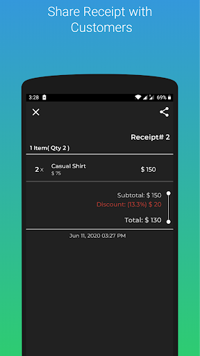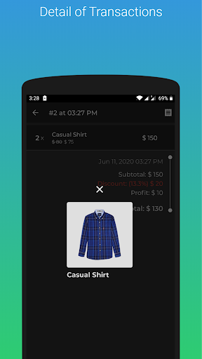 باستخدام السلم POS يمكنك بسهولة إضافة منتجات مع صور وتعيين الأسعار في عملتك. يمكنك ببساطة بيع المنتجات لعملائك بإضافة خصومات ويمكن أيضا تغيير سعر البيع الخاص بكعملاء محددين.سيقوم بإنشاء إيصال رقمي يمكنك مشاركتها. تحقق من مبيعاتك وأرباحك اليومية المكتسبة من المبيعات، كما أنه يساعدك أيضا في العثور على أفضل المنتجات الأكثر مبيعا. ويمكن أيضا أن تعمل حاليا كأداة عرض.