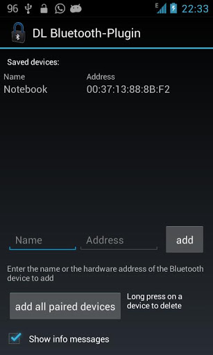 This is a plugin which automatically disables the lockscreen while your device is connected to a specific bluetooth device for example Bluetooth headset so you don39;t need to enter your PINpassword or pattern code while your device is near you or at least near your headset.Requires the 39;Delayed Lock39; or 39;DelayedLock Trial39; app version 2.0.8 or newer
