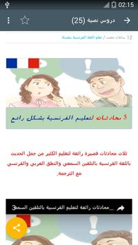 والمزيد نقدم لكم كل الدروس المقدمة على شبكة تعلم اللغة الفرنسية بنفسك من طرف اساتذة مختصين في تعليم الفرنسية وكل الدروس المكتوبة والفيديو بالصوت والصورة والبرامج والقصص والأفلام المترجمة والدروس التعليمية للمبتدئين والمتوسطين والكتب والبرامج وكل شيء على تطبيق واحد يمكنك تحميله بحجم لا يتعدى 8 ميغابايت الدروس التي سيتم تحميلها نصياً أوتوماتيكيا بحجم 1 ميغابايت فقط ونرجوا أن ينال هذا العمل المتواضع رضاكم ولا تنسونا من صالح دعائكم.