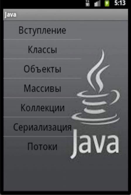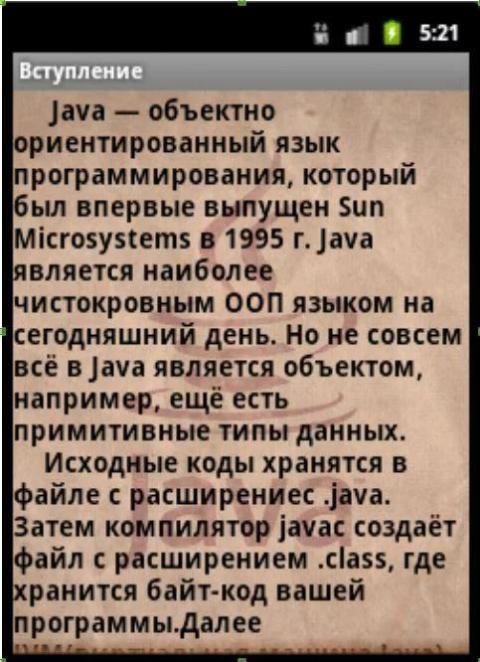 Russian language and a brief guide to Java now always with you. Interface is intuitively simple and without frills. This application is suitable for those who only decided to learn Java and those who have something to hack. In theory including a brief description, the main themes of listings. The theoretical material will be constantly updated.