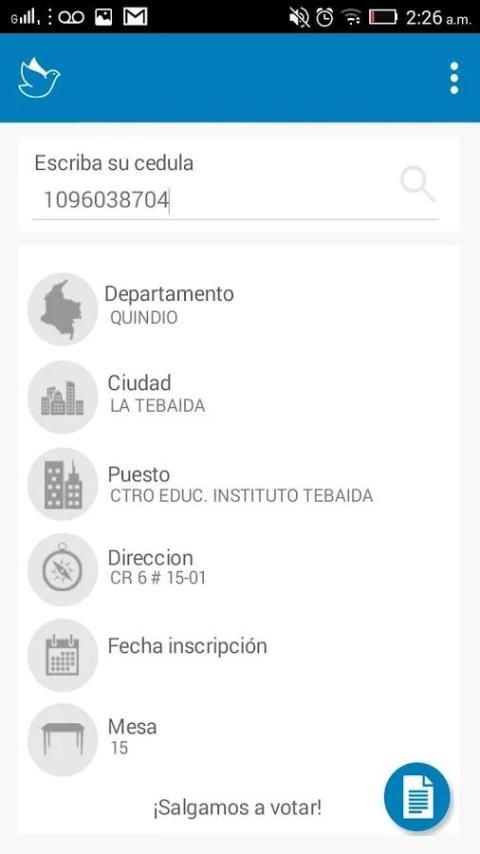 في 2 أكتوبر، وسوف 2016 الكولومبيين حضور الانتخابات للحفاظ على موعدك مع الديمقراطية وتقرر بين نعم ولا لتوقيع معاهدة السلام مع فارك، هو كيف تم تصميم هذا التطبيق بهدف استشارة كل مكان الاقتراع كولومبيانو وبالتالي ليس لديهم قيود عند حضور هذا الحدث مع الديمقراطية، تاريخ ومستقبل أمتنا.