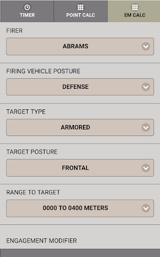 The Point Calculator allows to you calculate points acquired from up to four targets during crew gunnery engagements and verify the total points (19a) and the engagement score (19f) on DA Form 8265.