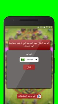 2- بعد ان يتم الاتصال بنجاح في قريتك على كلاش اف كلانس سوف نطلب منك اختيار كم من المجوهرات و الذهب تريد. بعد اختيارك يجب الضغط على زر التالي للمرور للنافدة الثانية من هكر كلاش اوف كلانس
