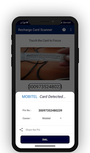This is recharge card scanning app. with this app, you can scan the recharge card through the camera built-in this app. then all you have to do is save the number which is taken from the camera and select the service provider. then clock the dial button. you will be directed to the dial app. there select SIM 1 OR SIM 2 and dial. that's it. you can do it within 10 seconds.
