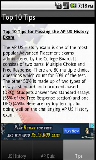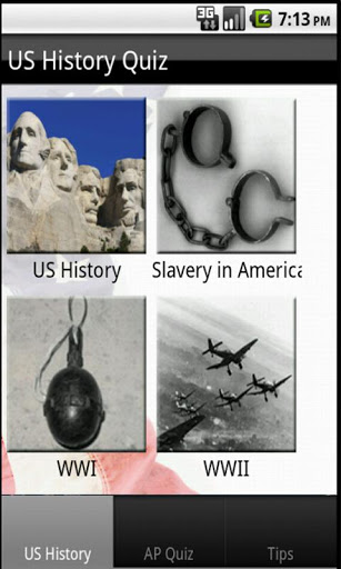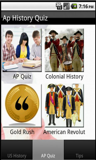 AP US History Exam Prep.The AP U.S. History Exam tests knowledge of U.S. History from the first European explorations of the Americas up through modern times.Exam tips to help youThis is free app for students who are prepairing for US History exam.Interactive quiz will be beneficial in scoring and let you know about your preparation of exam.The Founding Fathers might have put their pens quills to paper the Declaration of Independence in 1776, but AP US History goes all the way back to the days when quot;Christopher Columbusquot; was nothing but a catchy name. Feel free to give your view to update this app.The topics covered in this app are US History Slavery in America WWI WWII Roosevelt and Wilson U.S. Civil War US Depression Quiz Independence Pilgrim Missionary AP Quiz Colonial History Gold Rush American Revolution New york U.S. States amp; Cities Gilded AgeMake your learning easy.