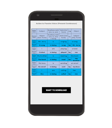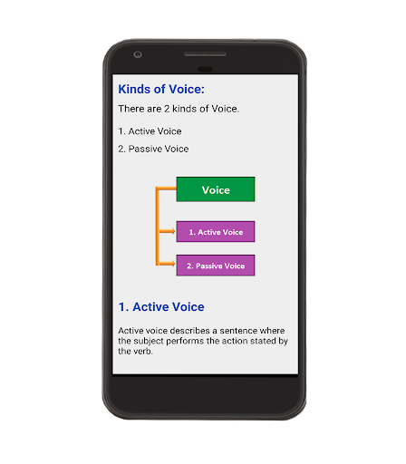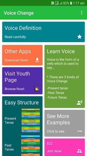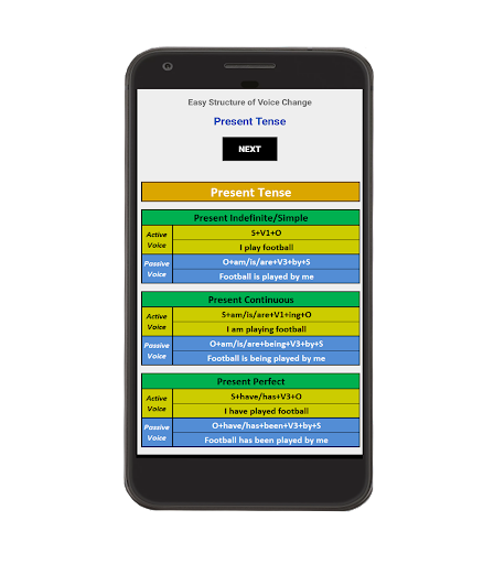 Man kann die Sprachänderung (tätig an Passiv) durch diese App leicht verstehen.Das Sprechen und das Schreiben von Englisch wird sehr einfach sein, indem Sie angespannte und Sprachänderungen lernen.