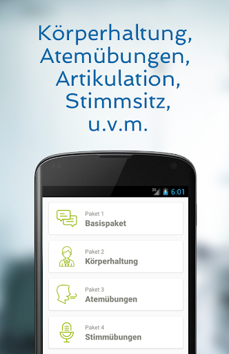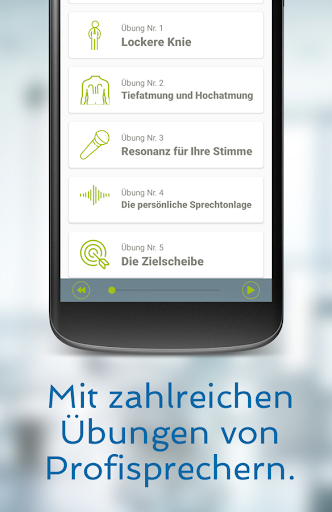 Mit dieser App lernen Sie auf vollkommen neue Art und Weise Ihre Aussprache zu verbessern. Die Übungen behandeln die Bereiche Körperhaltung, Stimme, Atmung, Artikulation, Vokale sowie Tipps für Präsentationen. Teil 2 der App beinhaltet zusätzliche Themen wie Tiefatmung und Atemstütze, Stimmsitz und Kraftstimme, Schnellsprechen und 'Verdichtetes Sprechen'.