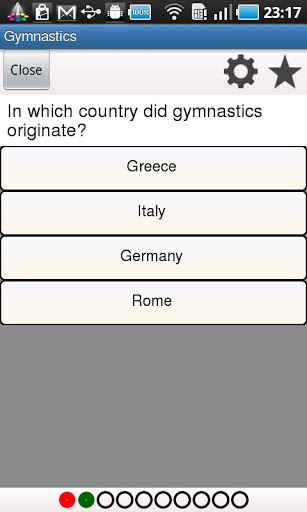 Enjoy fun, free Gymnastics quiz at your fingertips Challenge yourself or share with friends. The multiplechoice quiz format is easytouse, fun and educational. Play wherever you are at home, on the bus, or in the park.Gymnastics is a sport involving performance of exercises requiring physical strength, flexibility, agility, coordination, and balance. Internationally, all of the gymnastic sports are governed by the Fdration Internationale de Gymnastique FIG with each country having its own national governing body affiliated to FIG. Competitive Artistic gymnastics is the best known of the gymnastic sports. It typically involves the women39;s events of uneven parallel bars, balance beam, floor exercise, and vault. Men39;s events include floor exercise, pommel horse, still rings, vault, parallel bars, and high bar. Gymnastics evolved from exercises used by the ancient Greeks, that included skills for mounting and dismounting a horse, and from circus performance skills.WikipediaThink you know the answers? Download the app and prove itFEATURESFour options for each question, only one right answerComprehensive breakdown of your results.star tricky questions to return to later.Track your progress and see how you improve over time.Send questions to your friends on twitter and facebook or via email to see how they compare.Access to over 1000 more quizzes through the appNo registration necessaryPlay offlineWHAT WE DOYellowQueen make quizzes on 100039;s of topics, to help people all over the world learn and have fun together Now everyone can experience learning at their fingertips