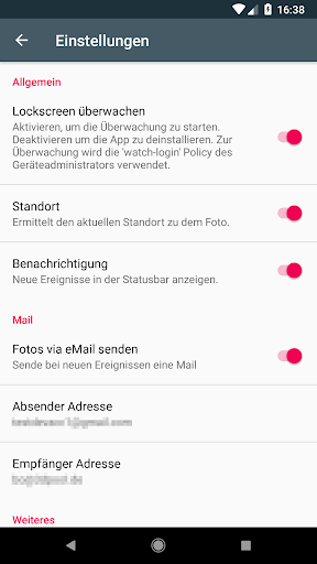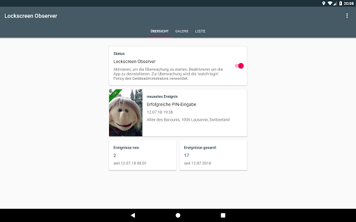 Sorge, dass jemand ohne Dein Wissen an Dein Handy geht? Wenn Du schläfst, kurz den Raum verlässt oder Du Dein Handy verlierst? Geh auf Nummer sicher, und finde es heraus. Lockscreen Observer fotografiert jeden mit der Frontkamera, der an Deinem Handy eine falsche PIN eingibt. Lass Dir das Foto mit den aktuellen Standortdaten des Handys als eMail schicken.