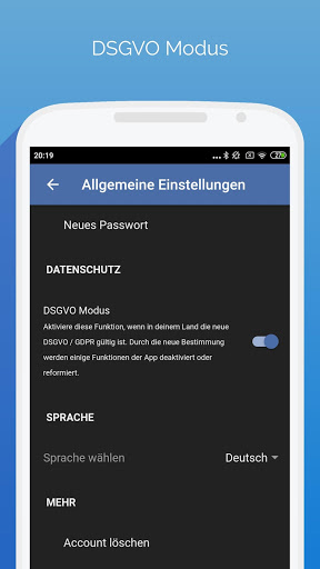 • DSGVO Modus: Wenn dieser aktiviert ist, wird dir die App nur noch Bereiche anzeigen, die in dem jeweiligen Land unbedenklich sind. Bitte aktiviere diese Funktion daher unbedingt, wenn du in einem Land lebst, in dem das Notieren von persönlichen Daten nicht mehr erlaubt ist.
