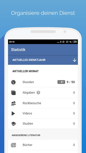 • Übersichtliche Monats- und Jahresstatistiken über Stunden, Abgaben, Rückbesuche, Videos und Studien