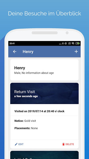 • Anlegen von Besuchen mit Personenangaben und die Möglichkeit, in einem übersichtlichen Rahmen Rückbesuche und / oder Studien anzulegen