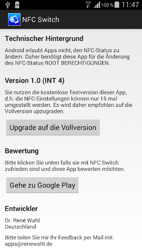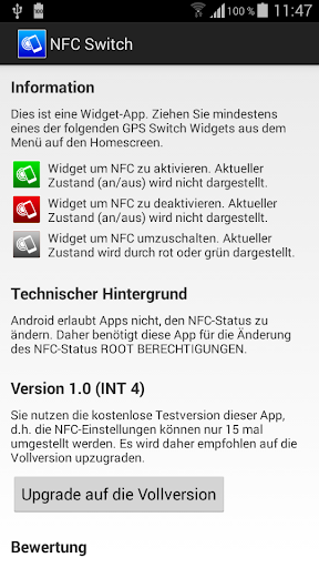 Die Umschaltung des NFC-Status ist für Apps normalerweise nicht gestattet. Deshalb benötigt diese App Root Berechtigungen. Falls Sie nicht wissen was Root bedeutet, installieren Sie bitte diese App nicht.