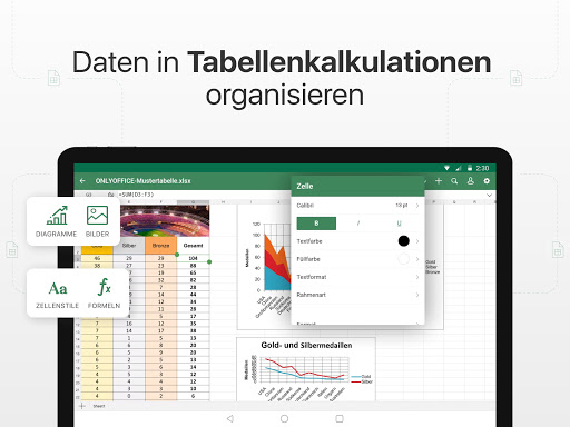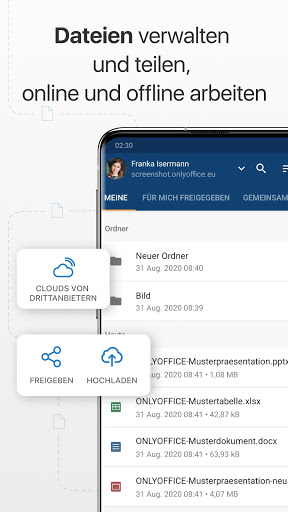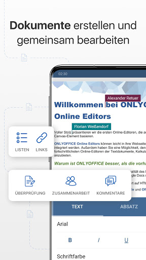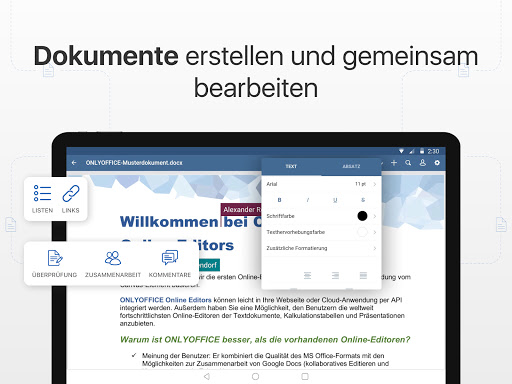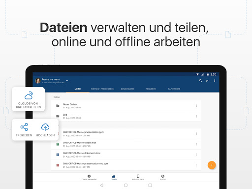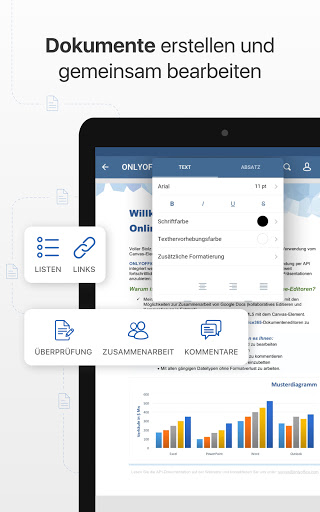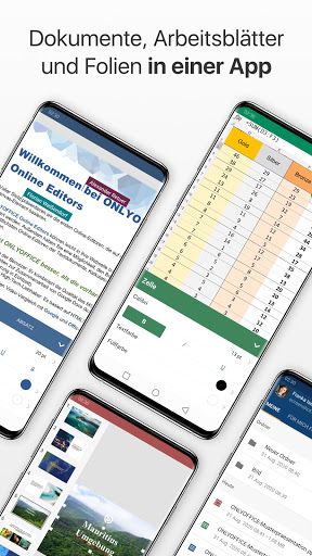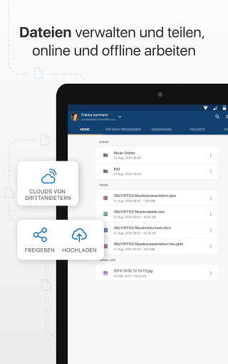 ONLYOFFICE Documents ist eine kostenlose App für die Arbeit mit Office-Dokumenten. Verwalten Sie mühelos Dateien, die in der ONLYOFFICE-Cloud gespeichert sind. Bearbeiten Sie Dokumente gemeinsam mit Ihren Teamkollegen. Öffnen, verwalten und bearbeiten Sie lokale Dateien.