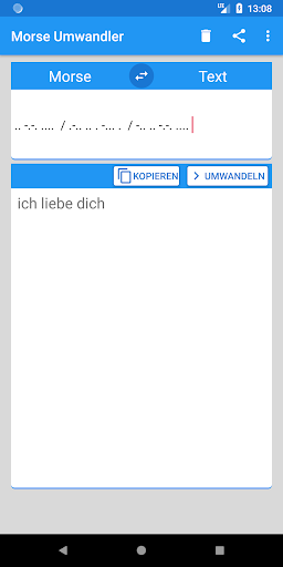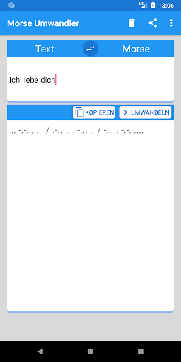 Mit dieser App ist es möglich Morsecode in Text und wieder zurück zu übersetzen. Einfach probieren! Vielleicht hast Du ja auch mal Lust, hier einen Text zu schreiben, und schließlich einen Liebesbrief, in dieser verschlüsselten Form zu verschicken, schließlich gehen diese drei Worte am Anfang nur schwer über die Lippen, oder Du verschickst eine SMS, die keiner mitlesen kann...die oder der Angebetete hätte mächtige Probleme aus den Zeichen " .. -.-. .... / .-.. .. . -... . / -.. .. -.-. ...." die Worte "ich liebe dich" zu machen... und Dir würde man zumindest Einfallsreichtum unterstellen..