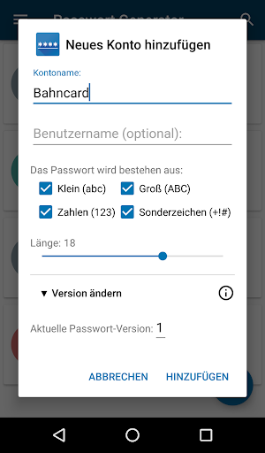 Wenn Sie ein Passwort für ein Benutzerkonto generieren möchten, so können Sie dieses Konto zu Privacy Friendly Passwort Generator hinzufügen. Dafür müssen Sie lediglich festlegen, welche Zeichen (Kleinbuchstaben, Großbuchstaben, Zahlen, Sonderzeichen) Sie im Passwort verwenden möchten und wie lange das Passwort sein soll.