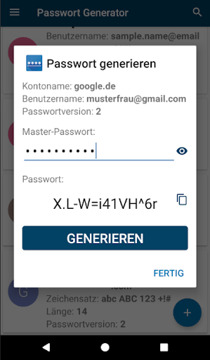 Die hinzugefügten Benutzerkonten werden in einer Liste angezeigt. Um ein Passwort für ein Benutzerkonto in der Liste zu generieren müssen Sie nur darauf tippen und Ihr Masterpasswort eingeben. Das Masterpasswort ist ein von Ihnen erdachtes Passwort, welches alle generierten Passworte schützt. Wie alle anderen Passworte auch, wird es nicht in der App gespeichert. Wenn Sie möchten können Sie sich das Masterpasswort notieren und an einem sicheren Ort aufbewahren.