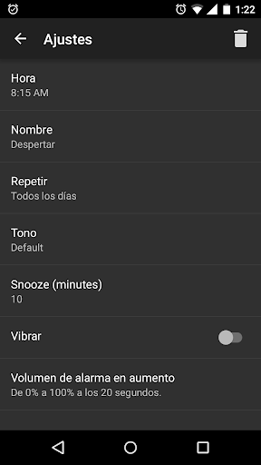 locales para tonos de alarma, dormitar, apagar y encender vibración,