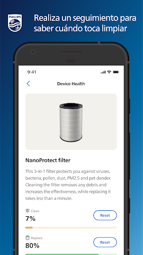 Air realiza un seguimiento para avisar cuando es hora de limpiar o sustituir ciertas piezas del dispositivo Air para garantizar que funciona al máximo rendimiento. Los mensajes y las notificaciones avisan cuándo se debe realizar el mantenimiento, y Air dispone de instrucciones paso a paso que te resultarán útiles llegado el caso. Además, en la mayoría de los casos, podrás comprar nuevos filtros directamente desde la aplicación.