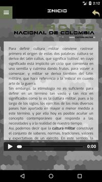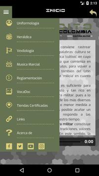 En esta aplicación encontraras información de los elementos visibles de la Cultura Militar del Ejército Nacional de Colombia, tales como la Uniformología (uniformes militares, insignias, condecoraciones y distintivos), Heráldica (escudos de armas y parches de la unidad), Vexilología (banderas, estandartes, banderines, gallardetes y corbatas conmemorativas), Música Marcial (himnos, animaciones, marchas, toques de corneta, oraciones, brindis), Vocabulario Doctrinal (terminología militar) y regulaciones sobre la materia.