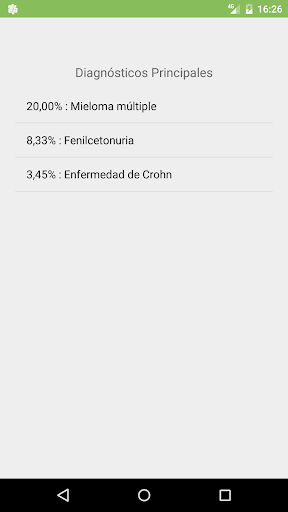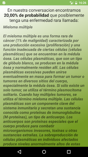 El usuario también puede ver, al final de la sesión, una breve descripción de las afecciones más probables de aplicar a los síntomas discutidos. Esta característica permite al paciente o a la familia obtener una sugerencia firme, incluso si la sesión dura mucho tiempo o incluso se completa durante muchas sesiones, con la esperanza de ayudar en la dirección correcta hacia un diagnóstico adecuado.
